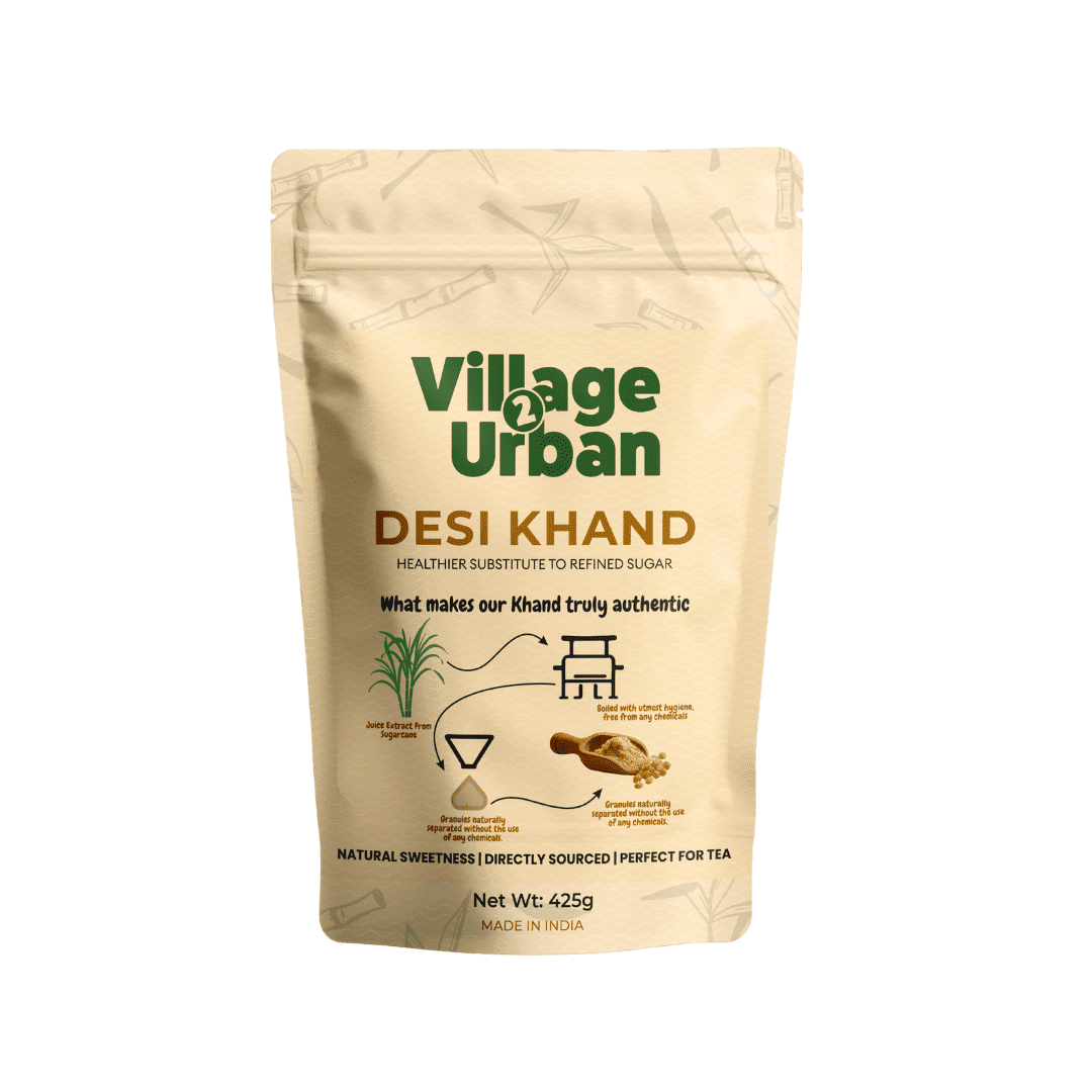 Village2Urban Desi Khand is a natural, chemical-free sweetener made from fresh sugarcane juice. It is minimally processed and retains essential minerals, making it a healthier alternative to refined white sugar.